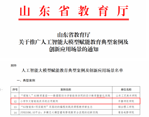1月5日,山东省教育厅公布人工智能大模型赋能教育典型案例及创新应用场景评选结果,学校提交的“小学作文智能批改系统应用案例”成功入选,这是我校推进“人工智能+教育”工作取得的又一项重要成果,体现了我校在人工智能与教育教学深度融合领域的积极探索与显著成效。